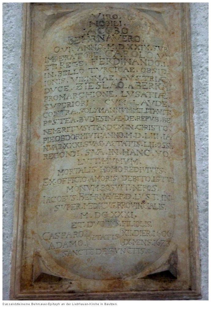 Am 5. Februar erinnerte Uwe Koch in einem Vortrag im Museum Bautzen an die mit der sächsischen Geschichte eng verwobene Familiengeschichte der Bautzener Familie Behrnauer. Mit der Übergabe des nunmehr von der Bautzener Firma agora restaurierten Epitaphs Jacob Behrnauers an der Bautzener Liebfrauenkirche wurde überdies ein geschichtlich bedeutsames Erinnerungsmal an die Beteiligung Oberlausitzer an den Kämpfen zur Abwehr der Streitmacht Sultan Süleimans des Prächtigen 1529 in Wien bewahrt. Die Behrnauers zählten vom 16. bis zum Ende des 19. Jahrhunderts zur bürgerlichen Oberschicht Bautzens und der Oberlausitz. Jacob Behrnauer d.Ä. war 1553 in Bautzen verstorben, sein Neffe, der mit einer Enkelin Caspar Peucers verheiratete Arzt Jacob Behrnauer d. J. setzte ihm 1631 dieses Denkmal. Über drei Jahrhunderte stellten die Behrnauers Bürgermeister, Ärzte, Pädagogen, Pastoren, hohe Verwaltungsbeamte und Intellektuelle. Karl Gottlieb Behrnauer (1765-1831)wechselte 1815 nach dem Wiener Kongress aus sächsischen Diensten in höchste Ämter Preußens. Im 18. Jahrhundert zählten der Bürgermeister Jeremias Behrnauer und sein Cousin der Rektor Georg Ehrenfried Behrnauer zu den für die Entwicklung der Mättigschen Stiftung prägenden Persönlichkeiten.
